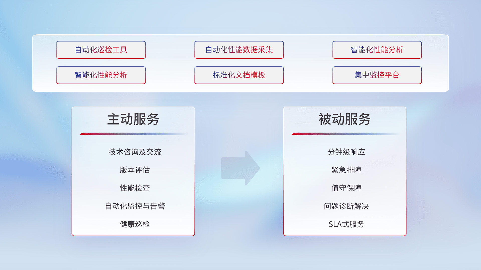 智能化工具和标准化文档,,保障服务质量,,,提供主动服务(包含技术咨询、、版本评估、、、、性能检查、、自动化监控与告警、、、、健康巡检)和被动服务包含(分钟级响应、、紧急排障、、、、值守保障、、、、问题诊断解决、、SLA服务)。。